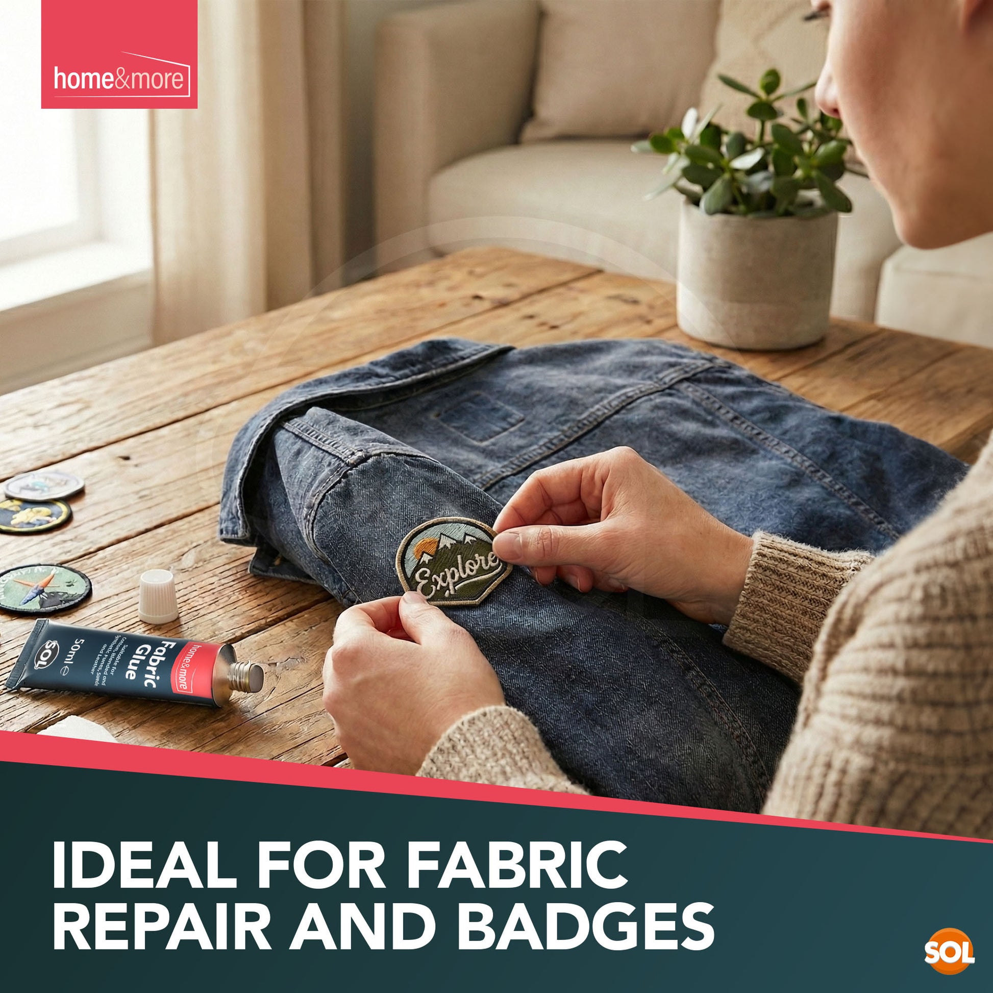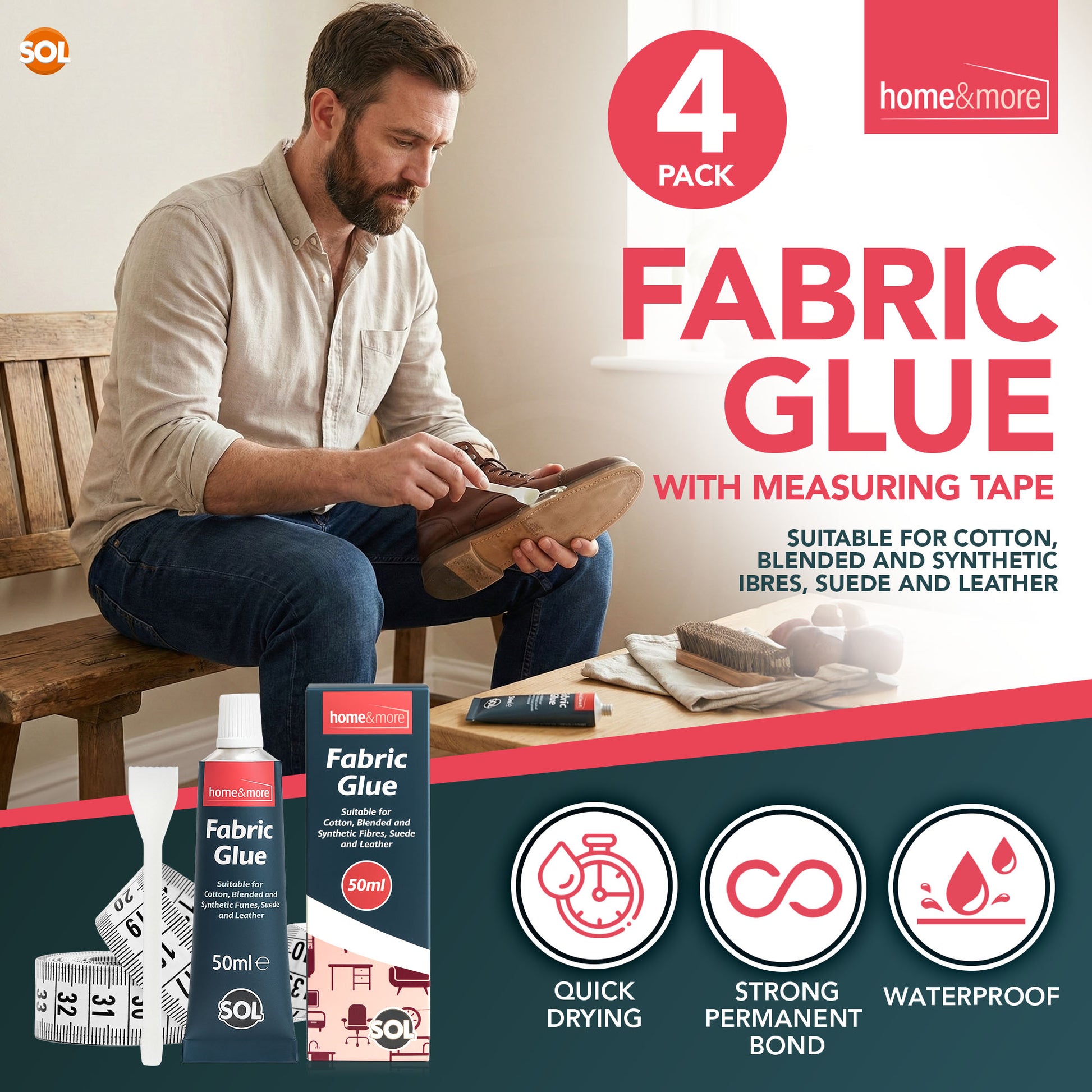 Our large 50ml tubes of sew craft material glue are a strong, quick drying, flexible, waterproof glue for fabric that can withstand machine washing and ironing. Perfect for most fabrics, such as hemming, turn-ups, curtains, clothing, labels, patchwork, badges, patches, soft toys, soft furnishings, most fabric repairs and alterations without sewing.