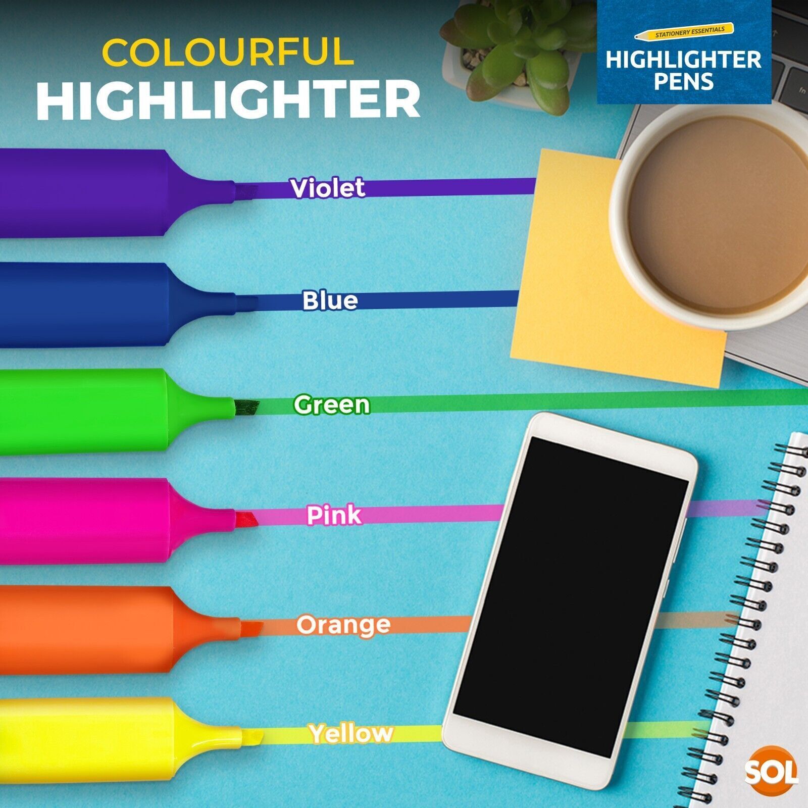 ULTRA-BRIGHT COLOURS: Each highlighter set contains 6 highlighter pen and six attractive and vivid bright stylish colours with yellow highlighter pens, pink highlighters as well as green, blue highlighter, purple highlighter and orange fluorescent pens that make emphasising text easy, whether at home or in the office.
