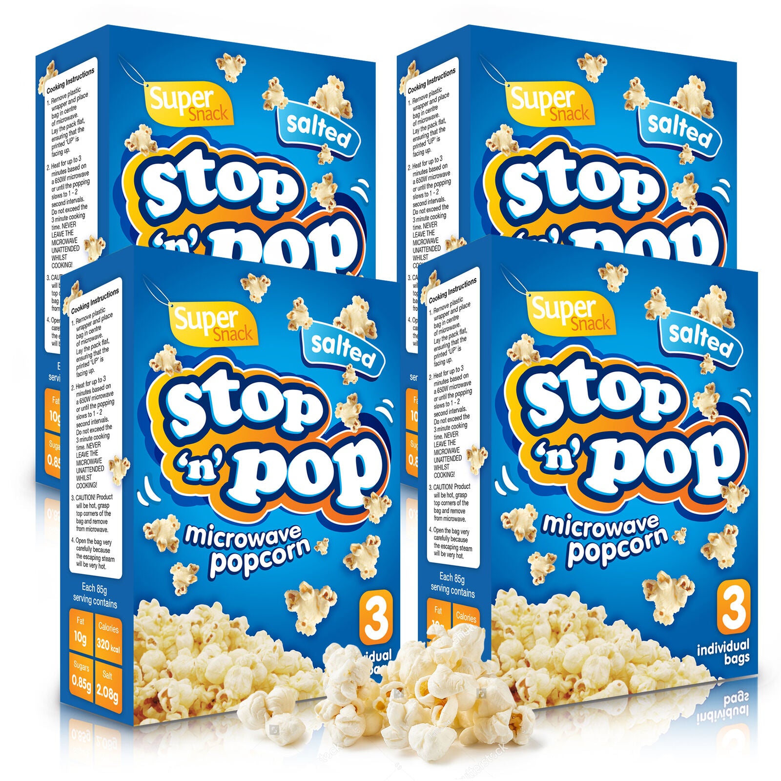 INCLUDES: 12 individual Salted Popcorn Bags across 4 boxes.