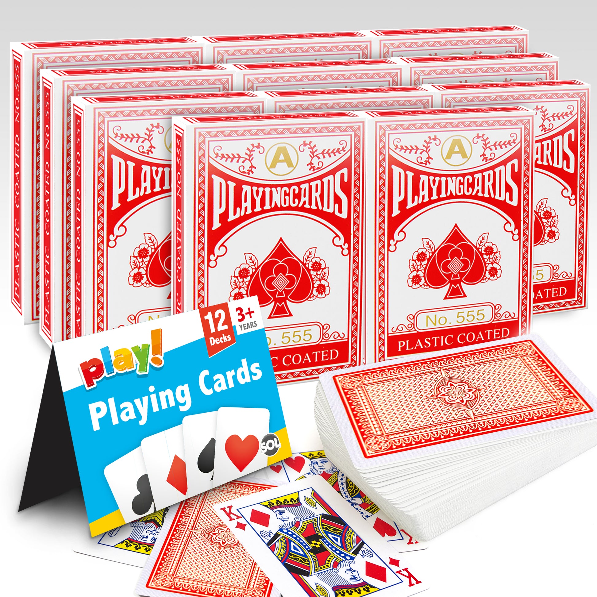 Inclusions: 12pk of Playing Cards. Deck of Cards: 52 total, 4 suits of 13 each. Clubs (♣) and Spades (♠) are black; Hearts (♦) and Diamonds (♥) are red. Jack (J), Queen (Q) and King (K) are face cards.