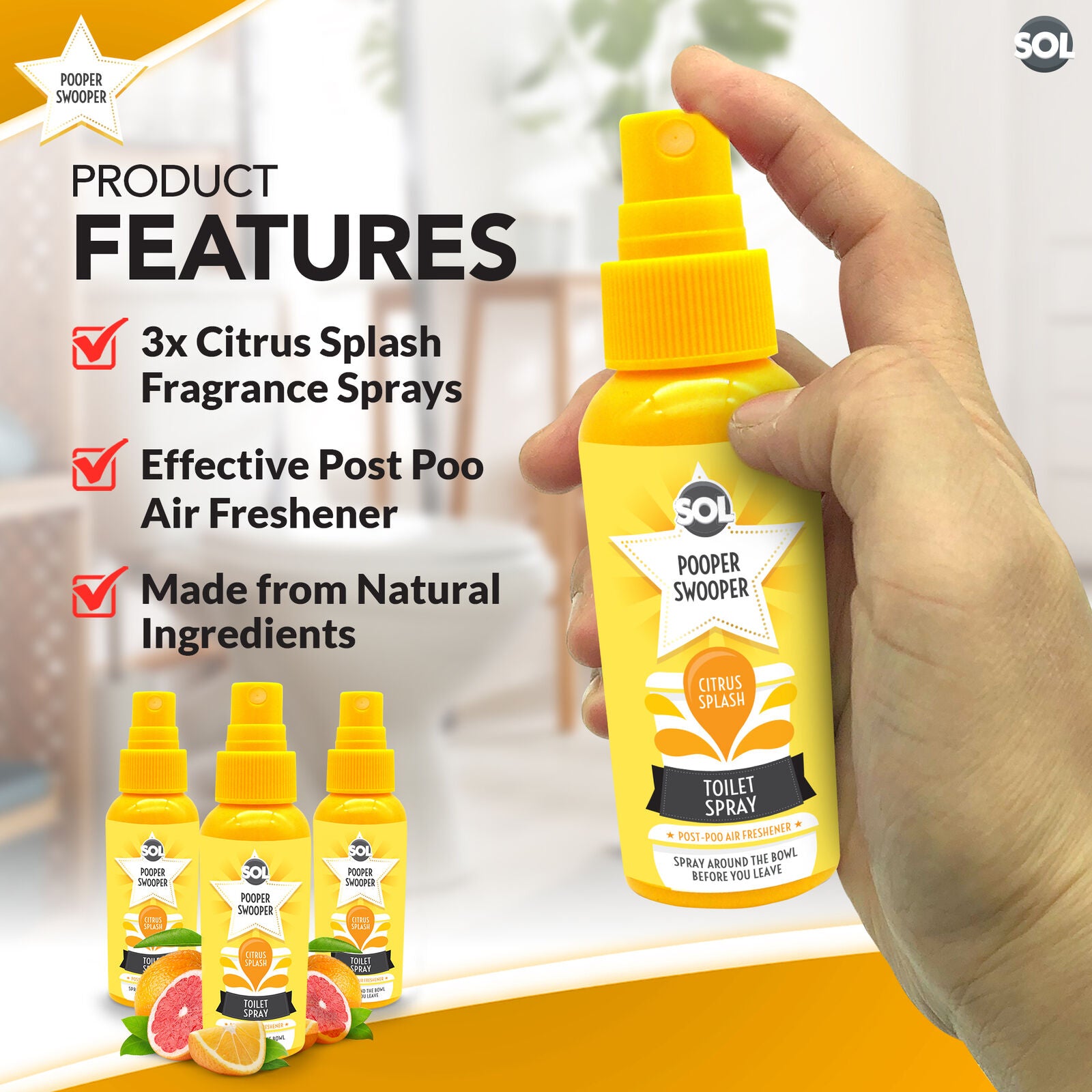 Pooper Star Toilet Spray | Citrus Fragrance Air Freshener | 3 Pack