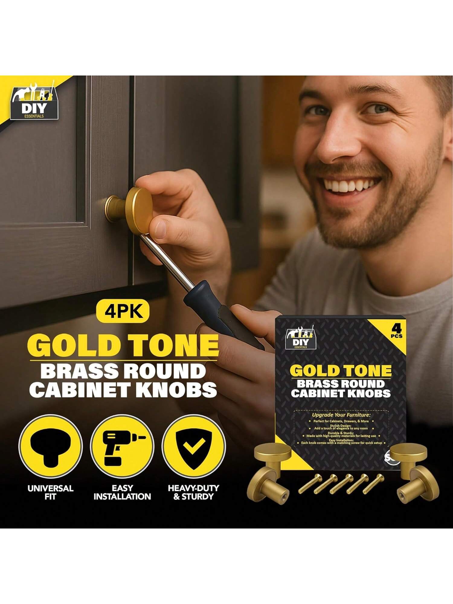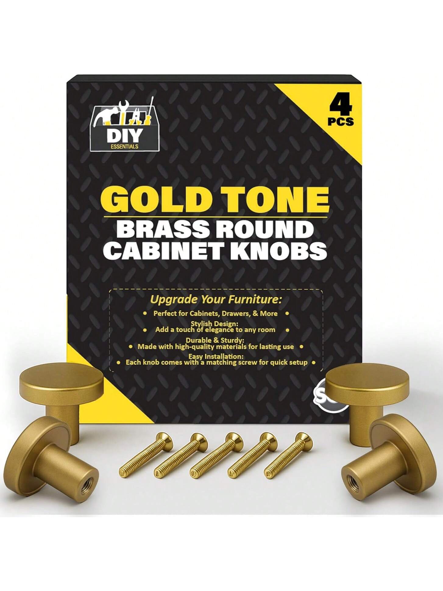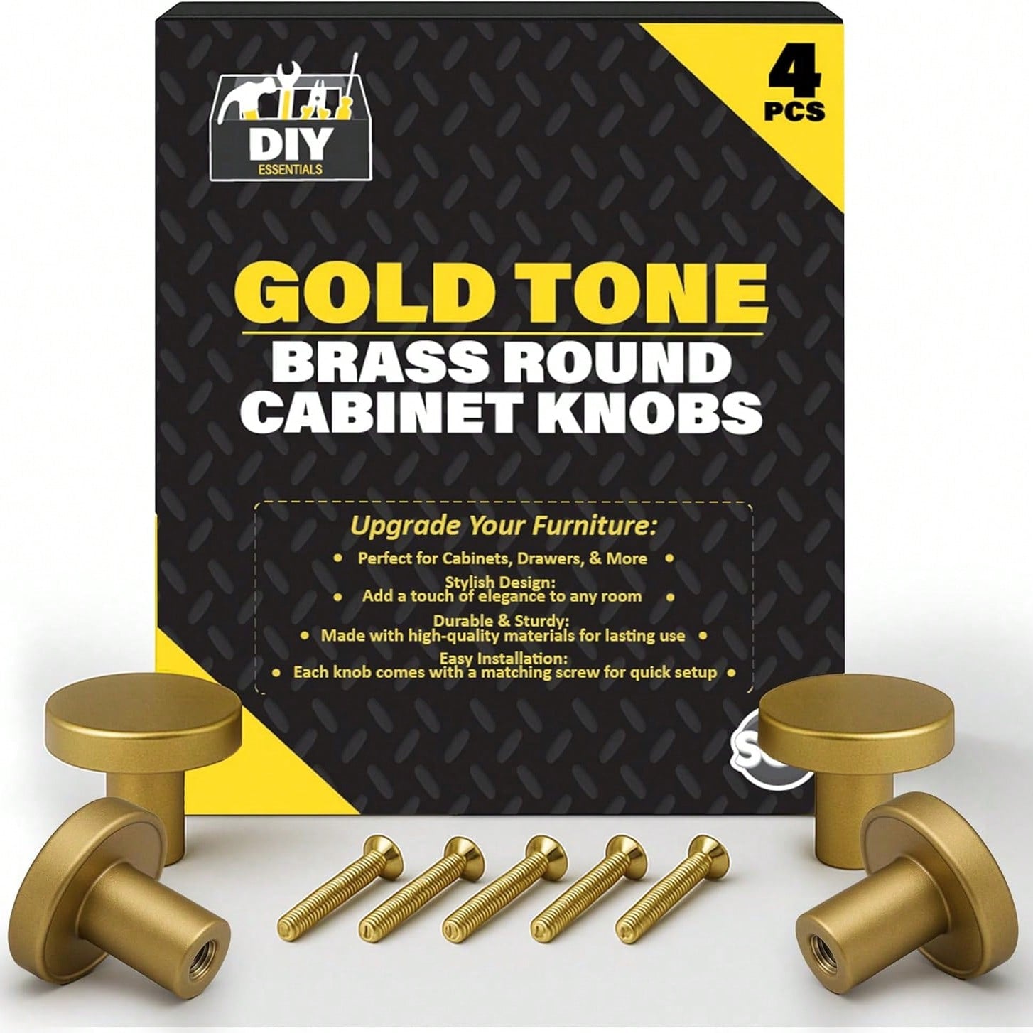 SOL 4pcs Gold Tone Brass Round Cabinet Knobs With Screws – Elegant Kitchen Cupboard Handles – Durable & Rust-Resistant Drawer Pulls – Classic Design For Wardrobes, Drawers & Furniture Restoration