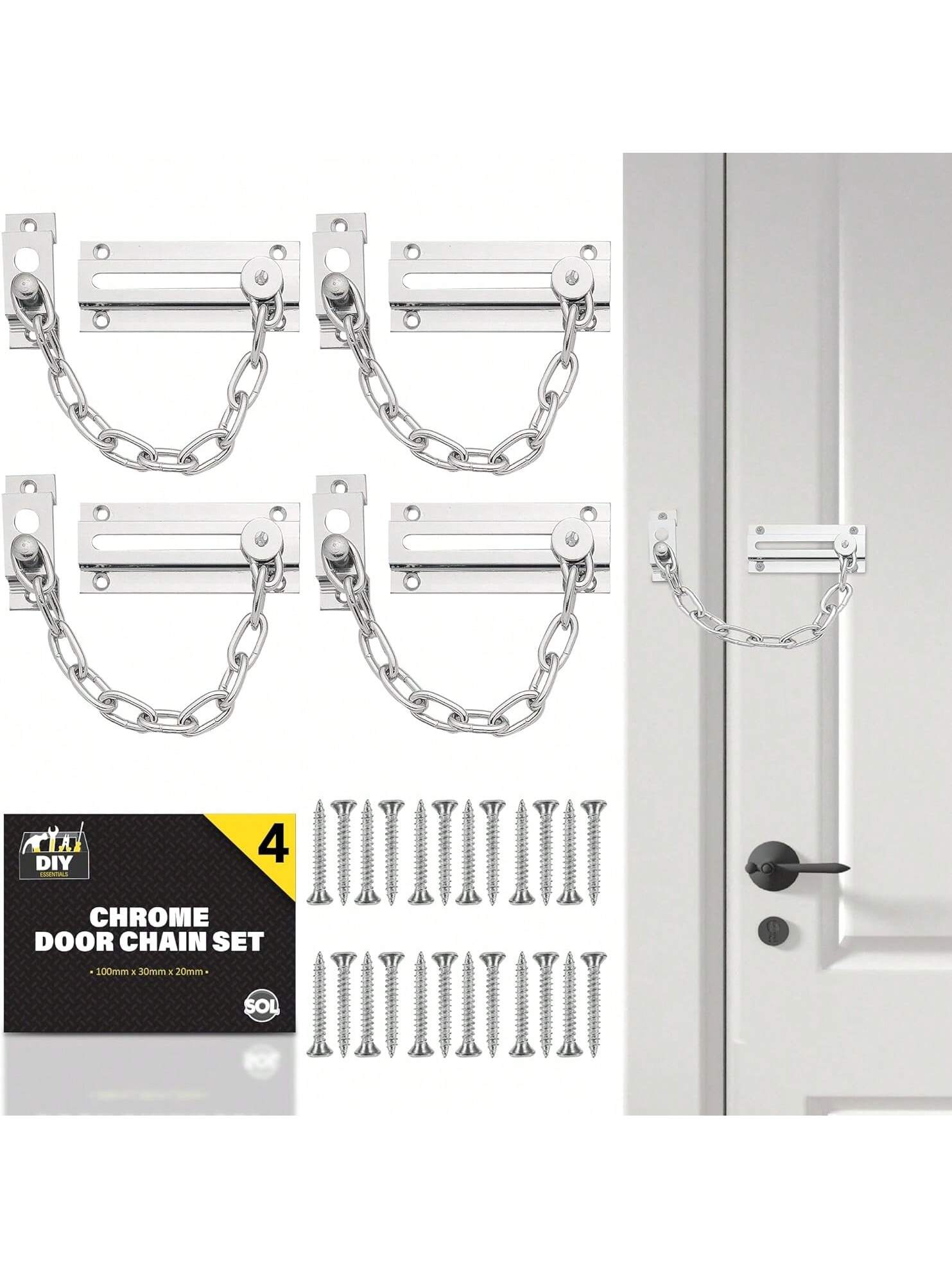 SOL 4pk Chrome Door Chain Kit – Restrictor For Front Door – Heavy-Duty Door Safety Chain Lock For Home Security, Added Protection, Peace Of Mind, Durable Metal Construction, And Easy Installation