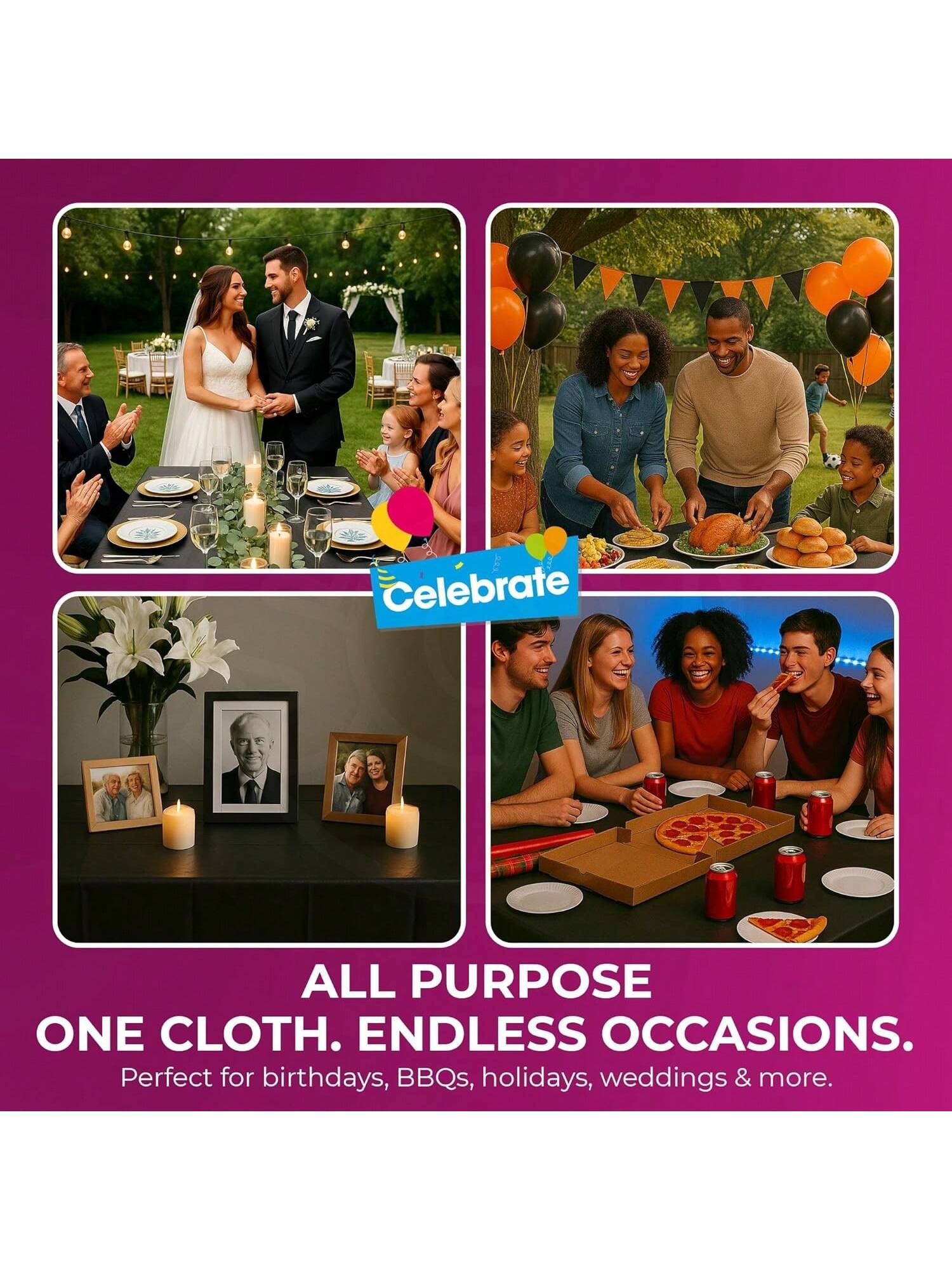 Multi-Purpose - Our 4pk black table cloth rectangular can be used for various occasions and different venues like; restaurants, parties, weddings, outdoor events, catering, gender reveal parties, theme parties and any other special events. If you have a spare it can be used to cover up the floor black table cloths party avoid any spills on the carpet.