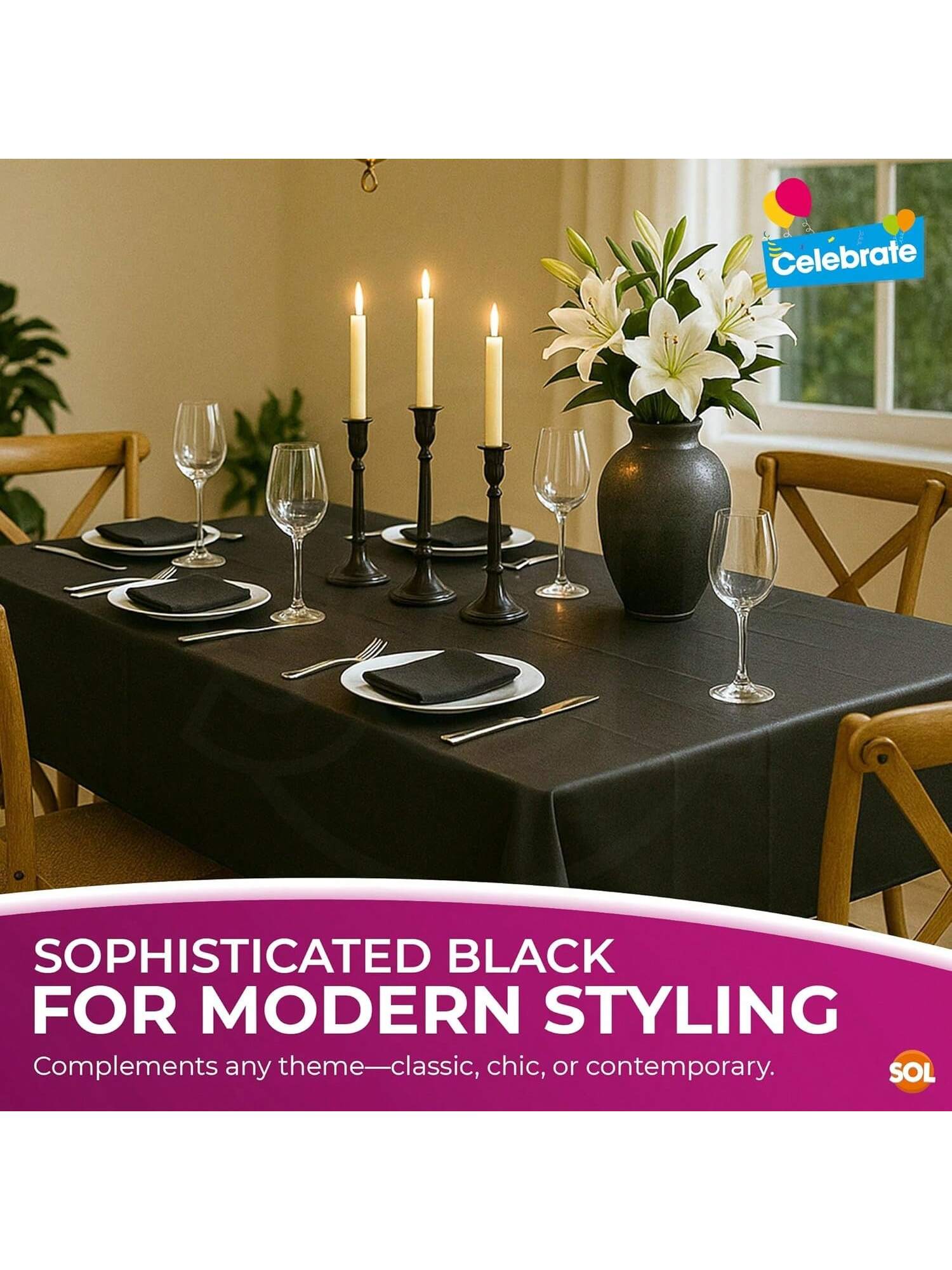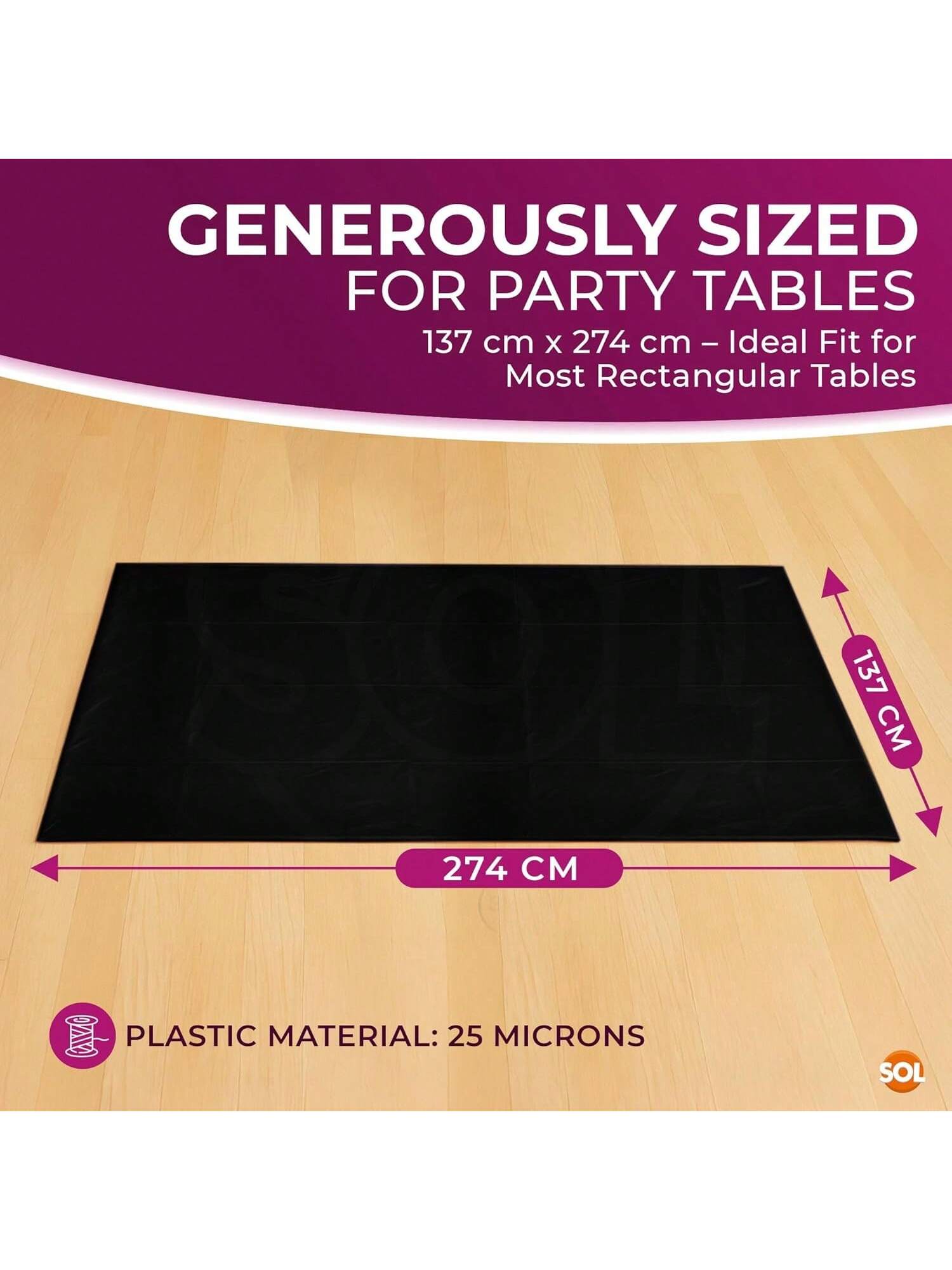 SOL 4pk Long Black Table Cloth Party 274x137cm Plastic Cover Tablecloth Disposable For Parties - Heavy Duty Spill Protection - Opaque Rectangular Design - Multipurpose For Weddings, Catering & Buffets