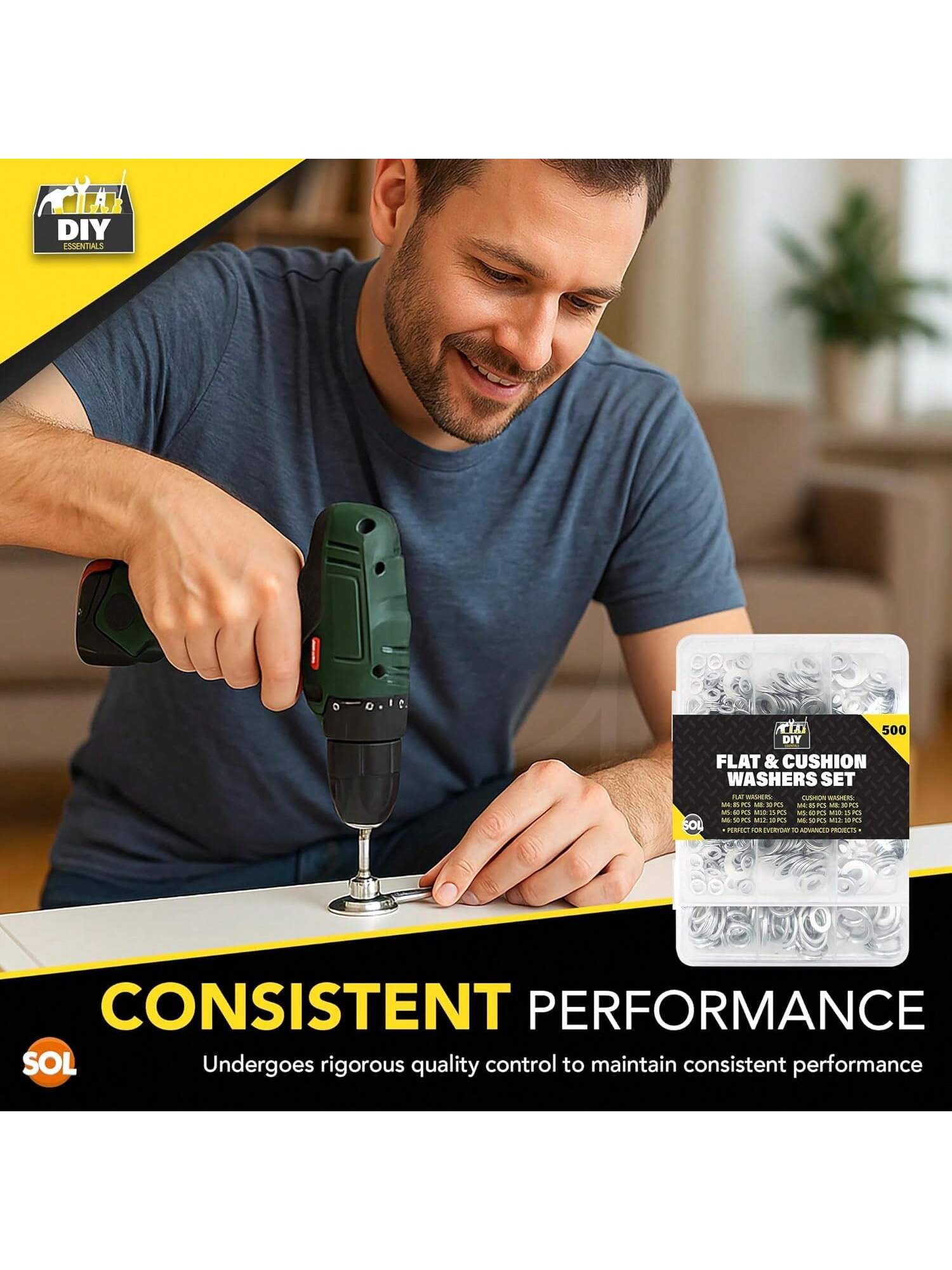 SOL 500pk Flat & Cushion Washers Set – Includes M4, M5, M6, M8, M10, M12 – Stainless Steel Spacers For Screws, Bolts, Nuts, DIY, Plumbing, Automotive, Machinery, Construction & Repair Projects