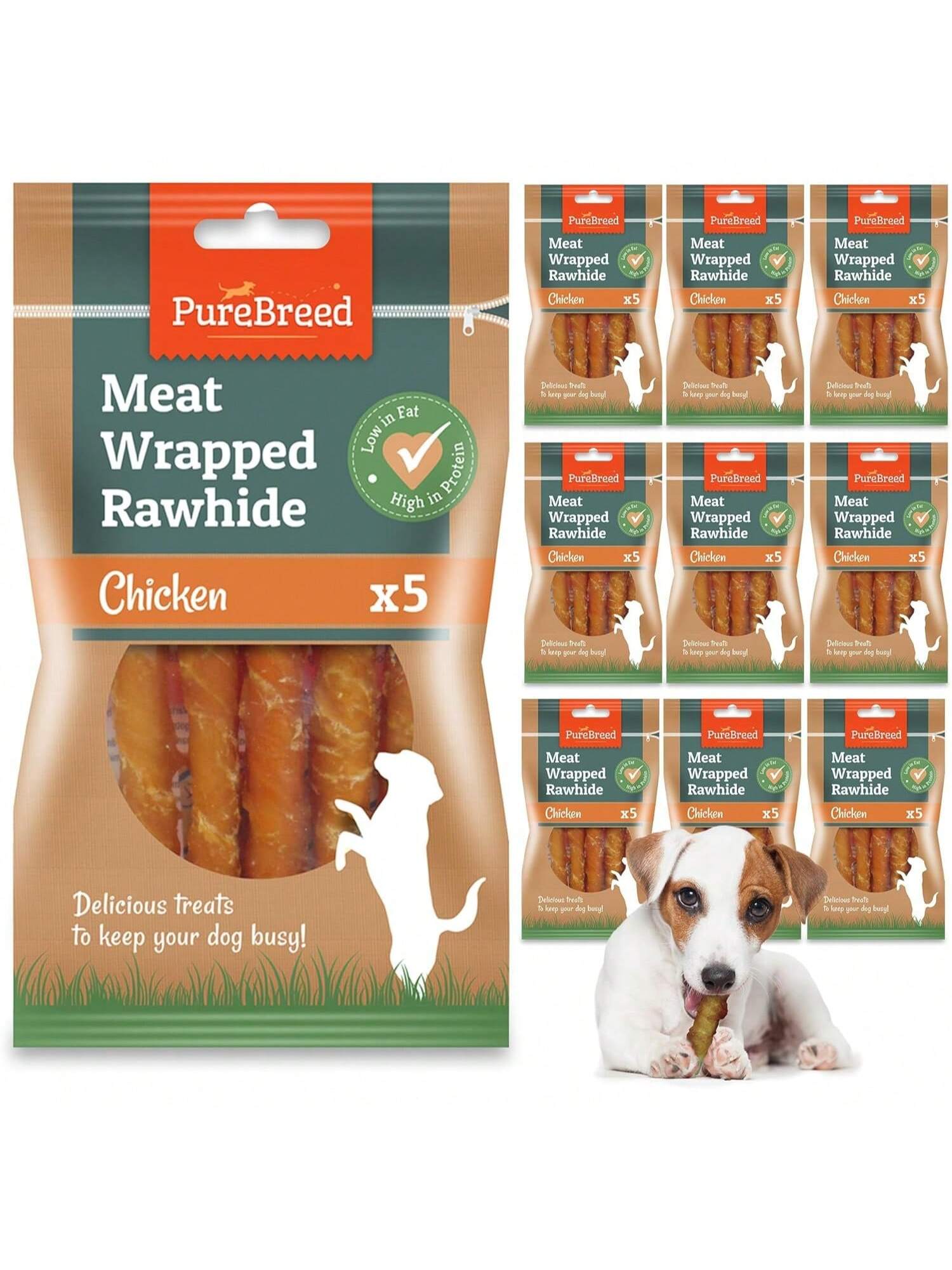 Our twist rawhide sticks have real chicken meat wrapped around it, making it irresistible for dogs to chew on, and is able to last quite long even with continuous chewing. Our dog chew toys' entire set comes with Ten (10) packs with Five (5) treats in each pack. More than enough dog sticks to last your dogs for weeks.