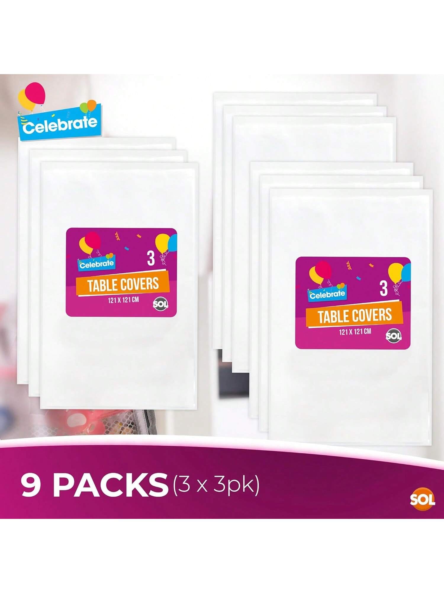 SOL 9pk White Table Cloth Party 121x121cm Plastic Cover Tablecloth Disposable For Parties - Heavy Duty Spill Protection - Opaque Design For Weddings, Buffets, Catering, Gender Reveals & Events