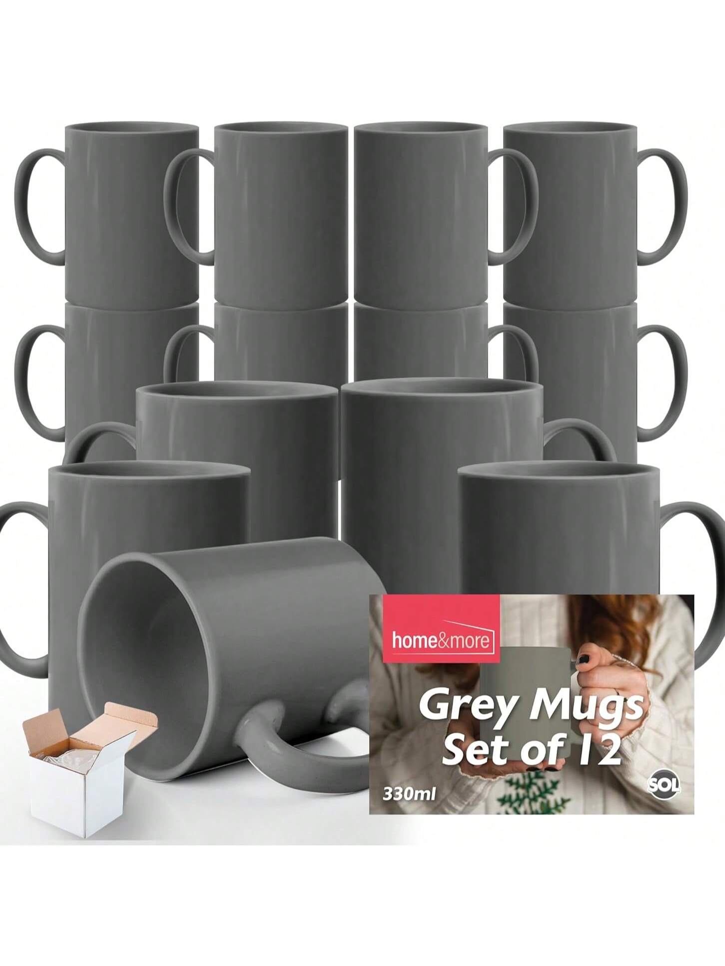 SOL Grey Mugs Set Of 12 – 330ml Coffee And Tea Cups – Durable Ceramic Drinkware For Hot Beverages, Latte, Cappuccino, Office, Home, Café, Microwave And Dishwasher Friendly