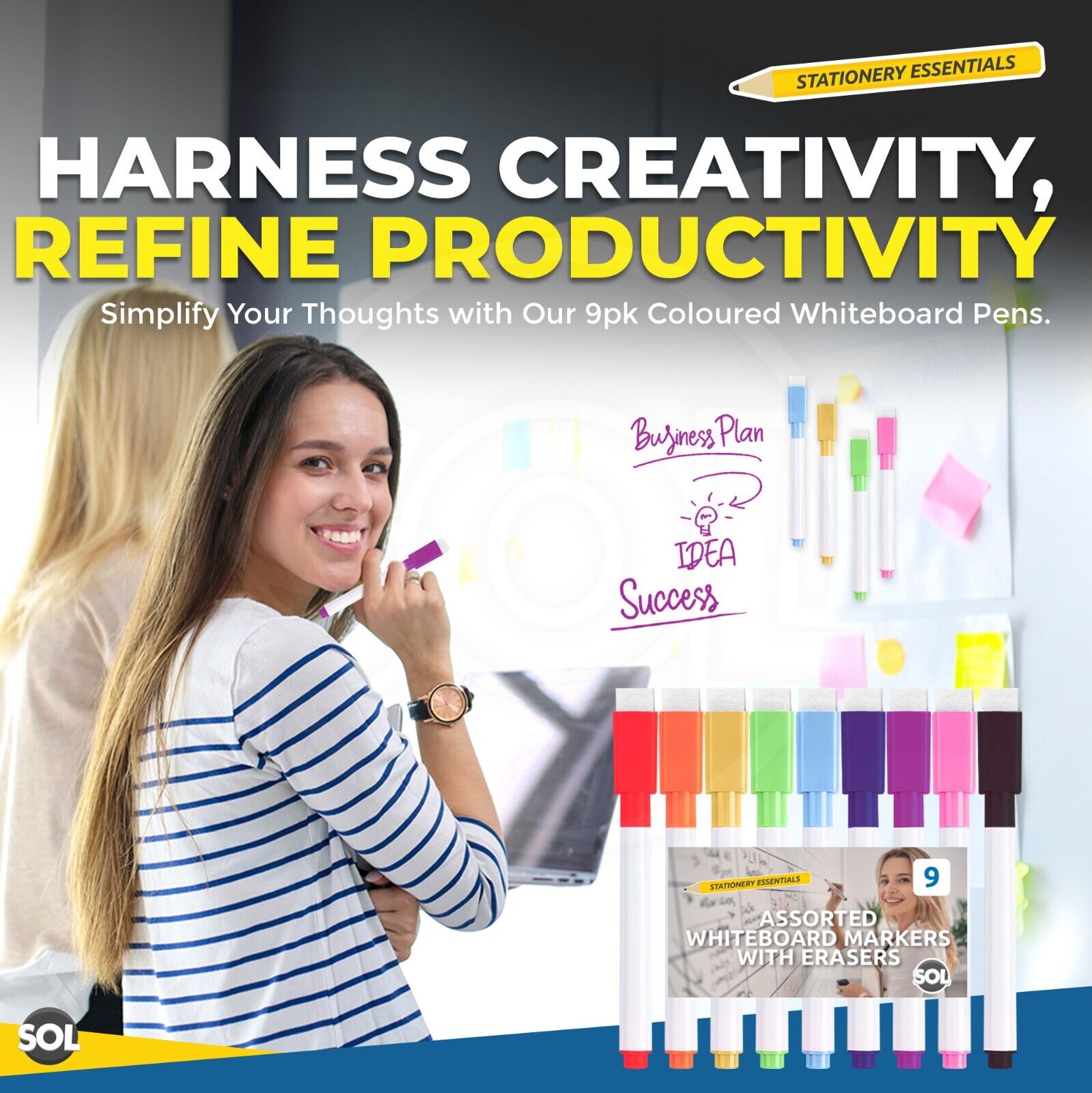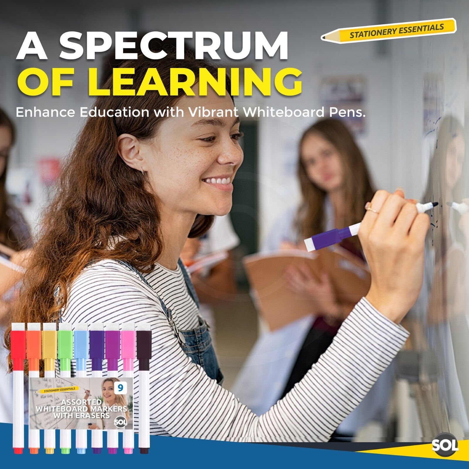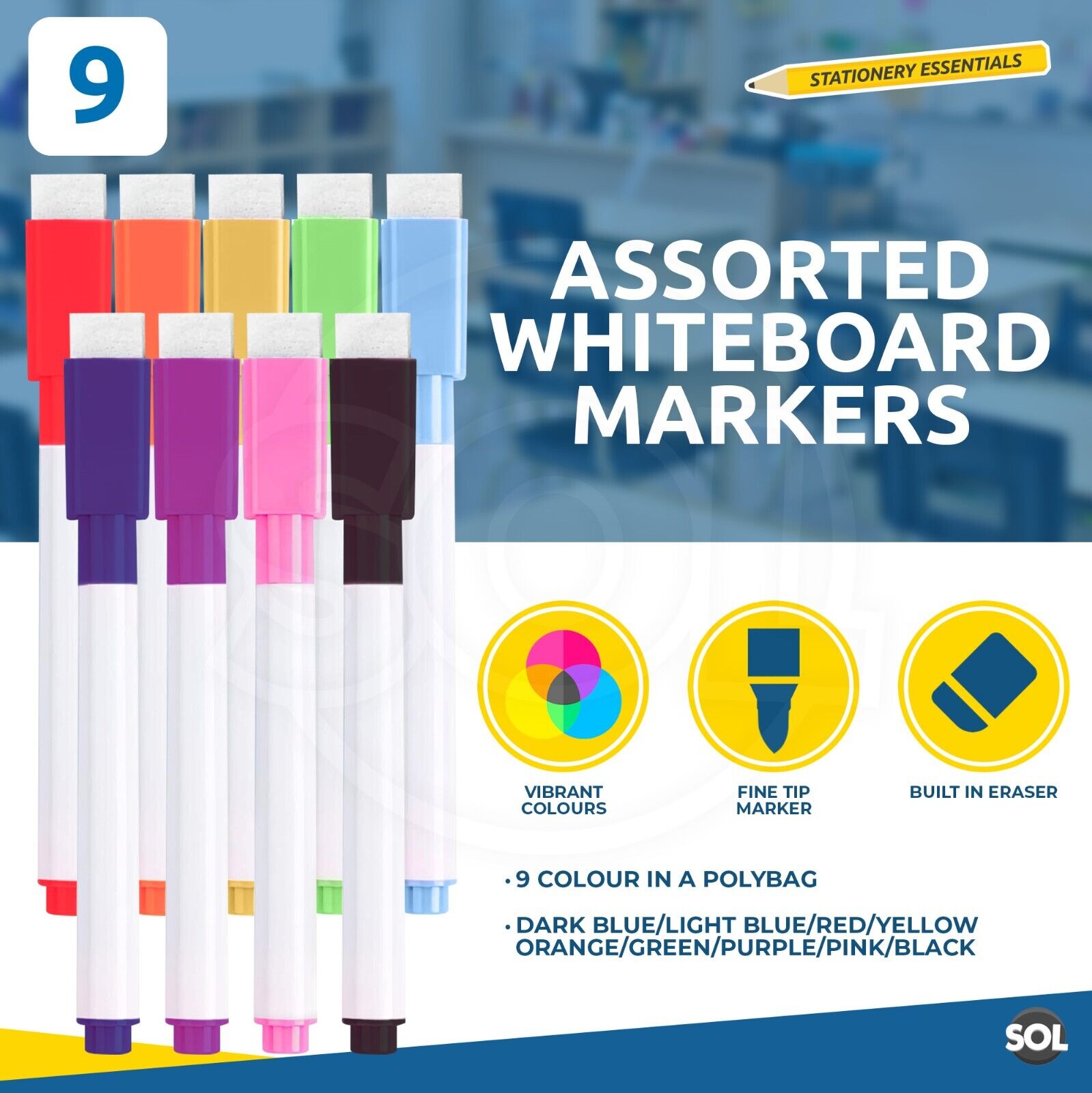 Vibrant Assorted Colours: Discover sophistication in every stroke with our white board pens and erasers. Choose from 9 elegant colours for artistic refinement. Perfect for highlighting, prioritising, and appealing to stationery and art enthusiasts.