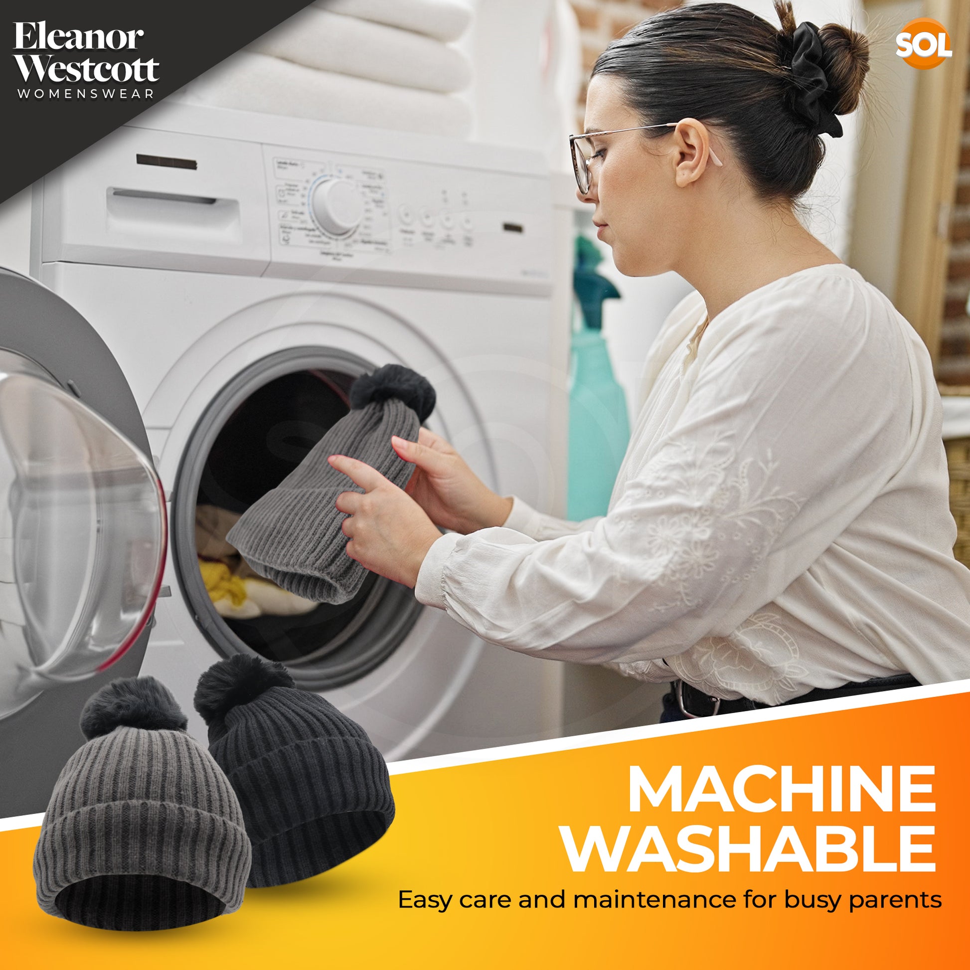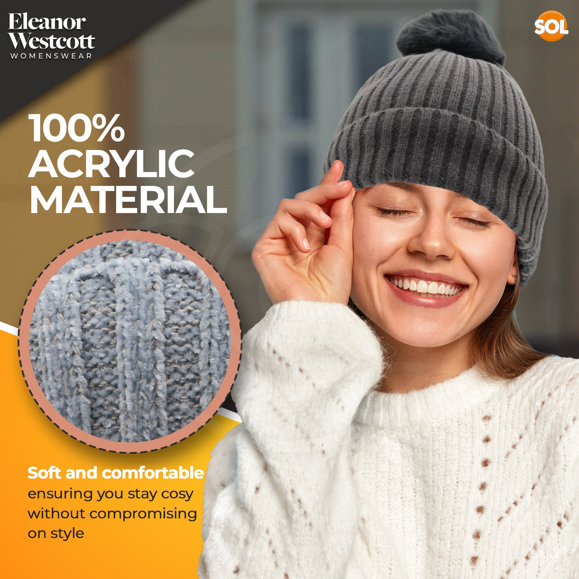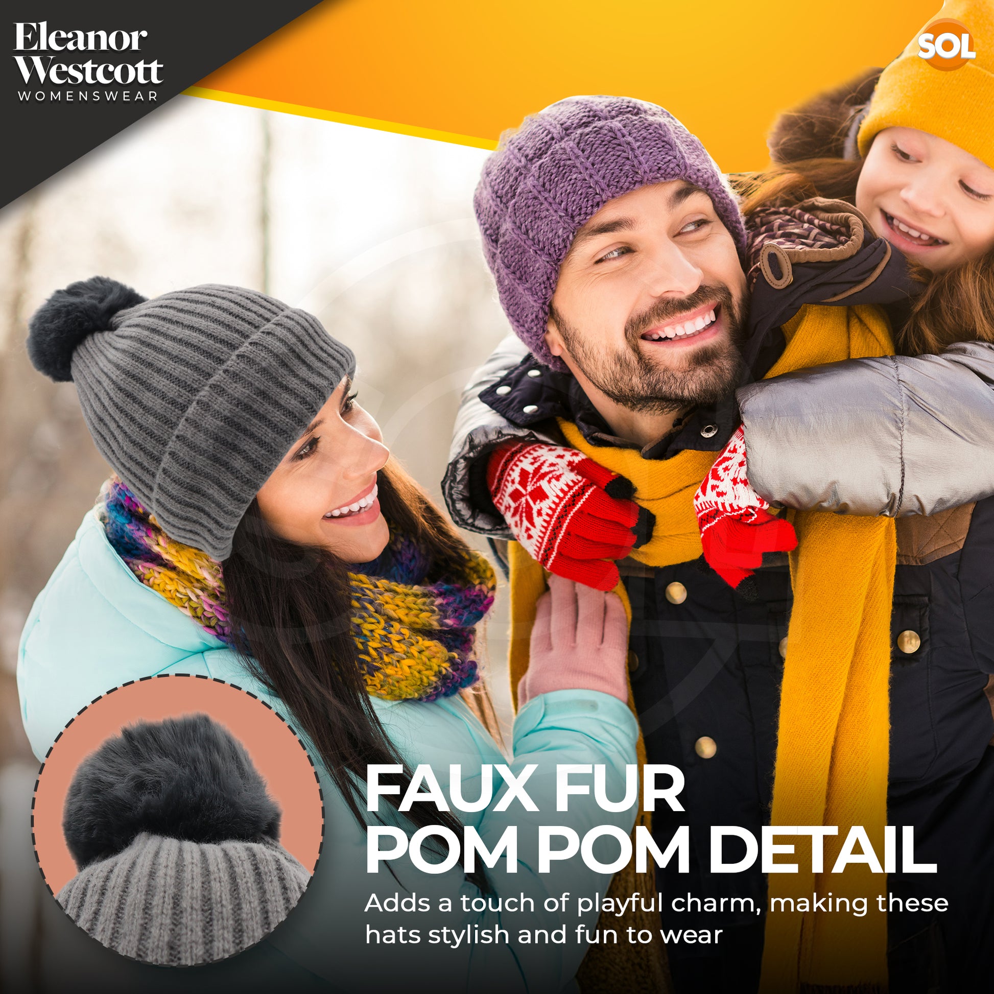 Women's Thermal Bobble Hat | Knitted Beanie with Faux Fur Pom Pom | Winter Warm Outdoor Wear | 2 Pack